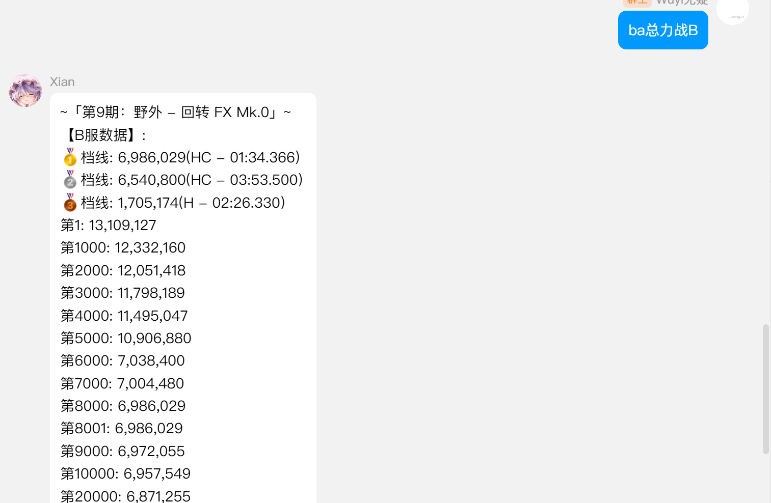 > 输入 Boss+分数 算总力战用时,输入示例:ba用时寿司12345678